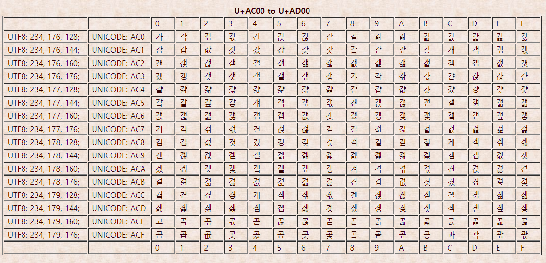 한글에 해당하는 유니코드표를 확인해보면 다음과 같다.